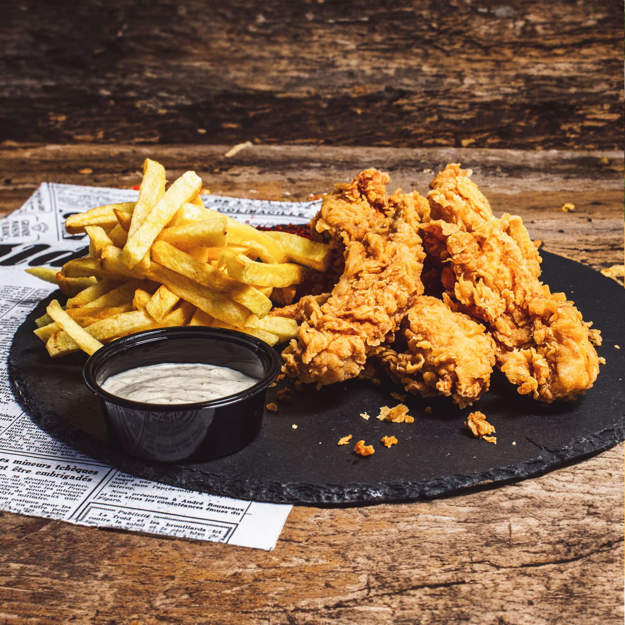 Meniu pui Crispy Strips Ne-Picant 400 grame: muschiulet din piept de pui proaspat (200g), cartofi prajiti proaspeti (150g), sos glenn (maioneza cu usturoi 50g), salata varza sau castraveti.
